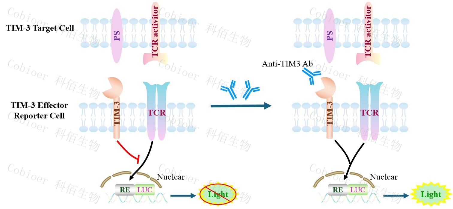 TIM-3 Effector Reporter Cell 報(bào)告基因藥靶模型很好的模擬了體內(nèi) TIM-3 的信號(hào)轉(zhuǎn)導(dǎo)過程,原理見下圖所示。![]() Figure 1. TIM-3 Effector Reporter Cell 細(xì)胞模型原理圖 |
