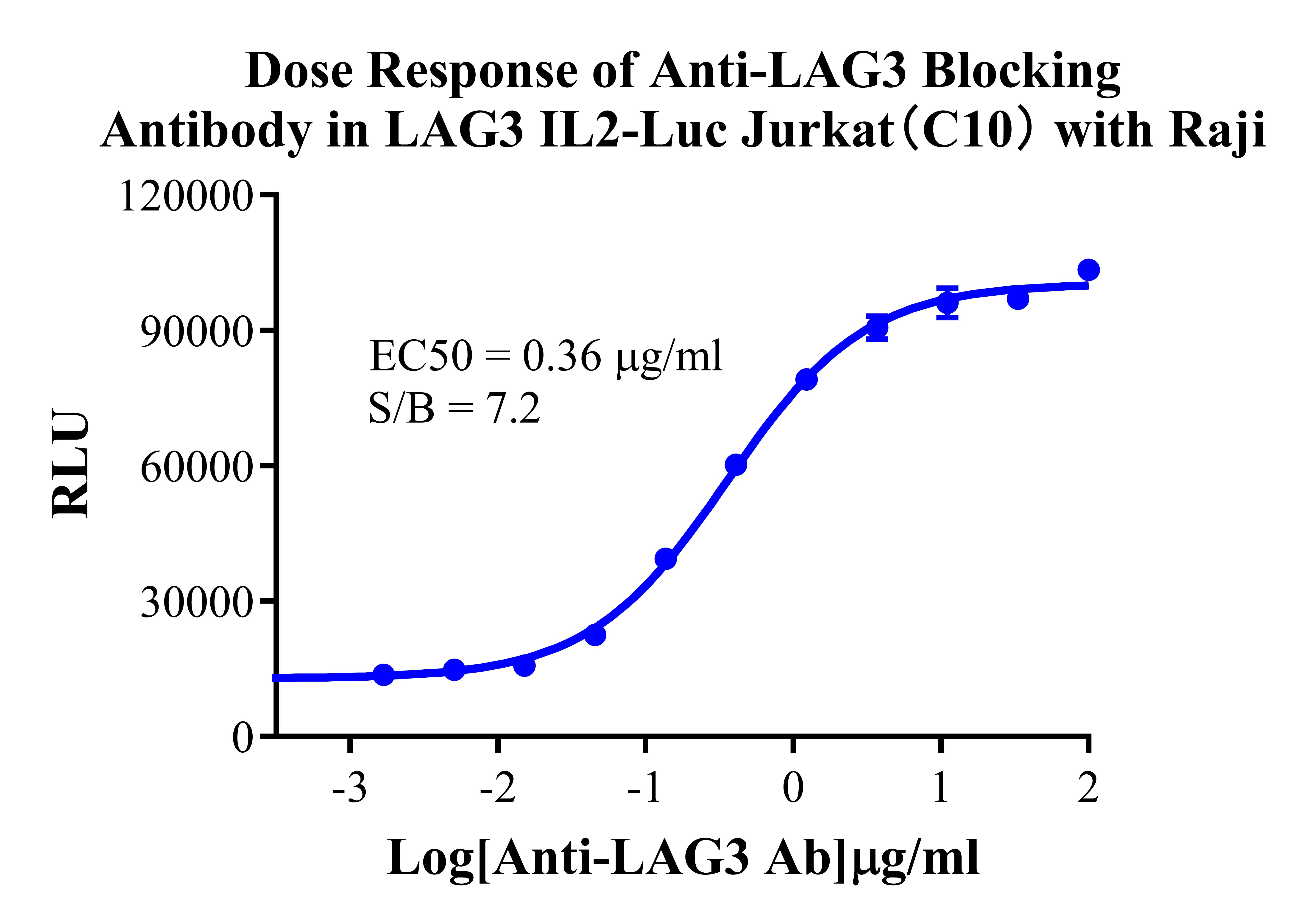 Figure 3. Detect Luciferase assay by Ultra Luciferase Detection Kit CBPH0001(we strongly suggest to purchase from Cobioer). Dose Response of Anti-LAG3 Blocking Antibody in LAG3 IL2-Luc Jurkat (C10) With Raji.