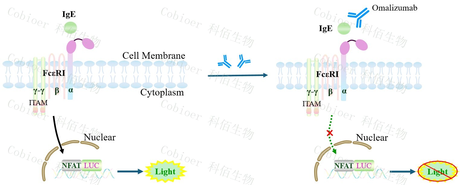 FcεRI Effector Reporter Cell 藥靶模型很好的模擬了 FcεRI的信號轉導過程,原理見下圖所示。