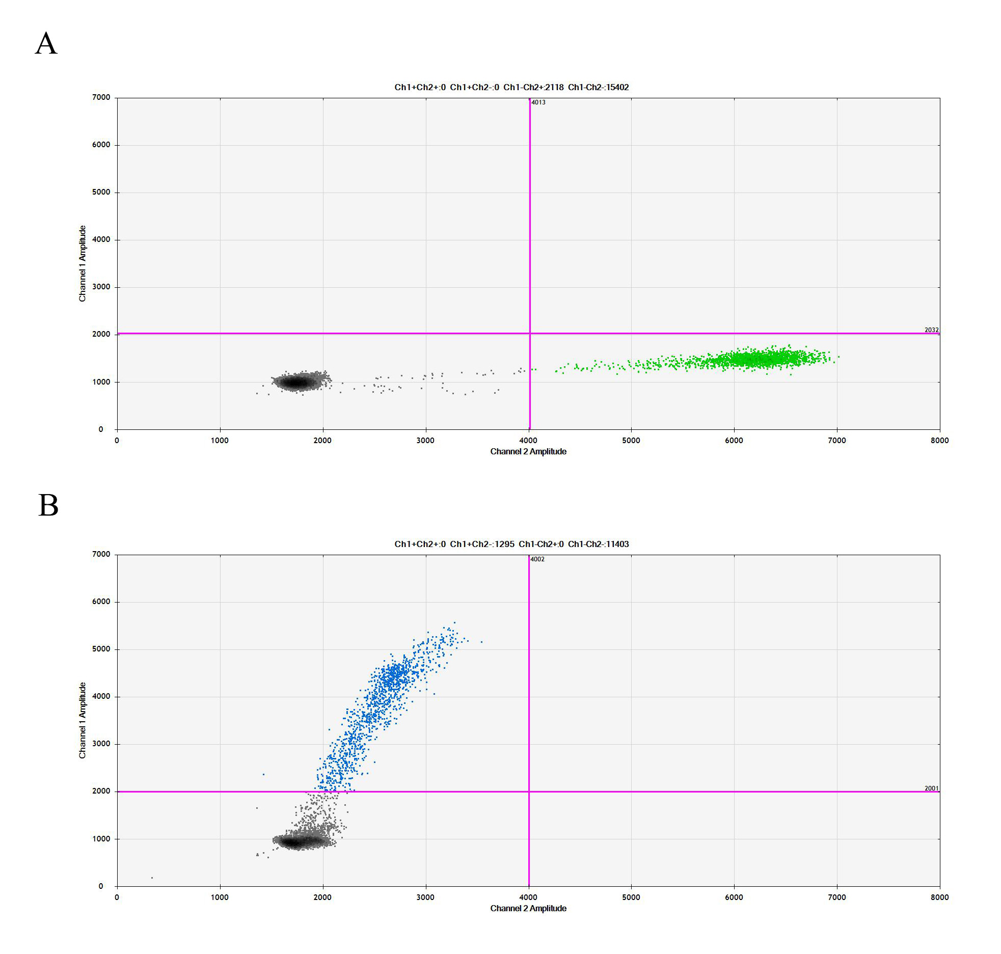Figure 3. A:MCF7 Parental Cell;B:ESR1[Y537N](Homozygous,AF%:100) Isogenic MCF7     通道2 藍(lán)色微滴代表ESR1[Y537N]突變陽性,通道2 綠色微滴代表該位點(diǎn)為陰性野生型