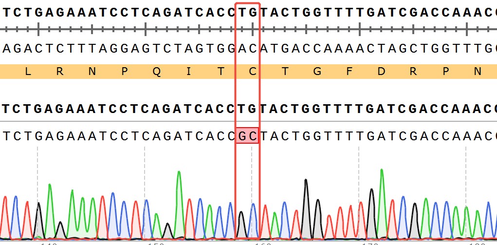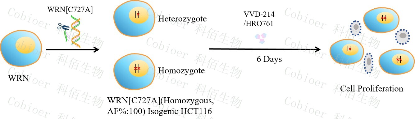 WRN[C727A](Homozygous,AF%:100) Isogenic HCT116 藥靶細胞,通過 基因編輯的方式將 WRN 的 727 位氨基酸胱氨酸(C)突變?yōu)楸彼幔ˋ)。![]() Figure 1. WRN[C727A](Homozygous,AF%:100) Isogenic HCT116 原理示意圖 |