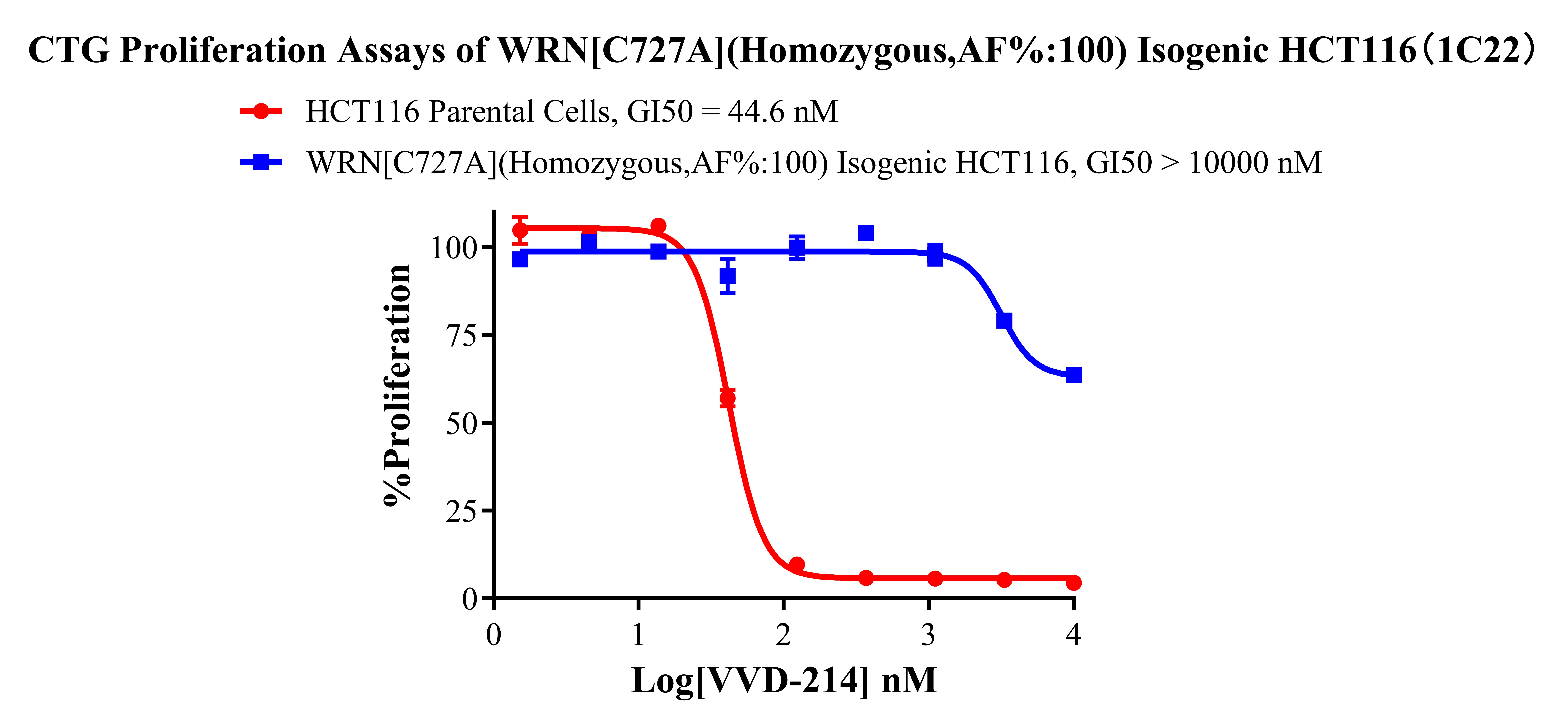 ![]() Figure 2. Sanger of WRN[C727A](Homozygous,AF%:100) Isogenic HCT116 ![]() Figure 3. A:HCT116 Parental Cell;B:WRN[C727A](Homozygous,AF%:100) Isogenic HCT116 通道2 藍色微滴代表WRN[C727A]突變陽性,通道2 綠色微滴代表該位點為陰性野生型 ![]() Figure 4. CTG Proliferation Assays of WRN[C727A](Homozygous,AF%:100) Isogenic HCT116(1C22). ![]() Figure 5. CTG Proliferation Assays of WRN[C727A](Homozygous,AF%:100) Isogenic HCT116(1C22). |