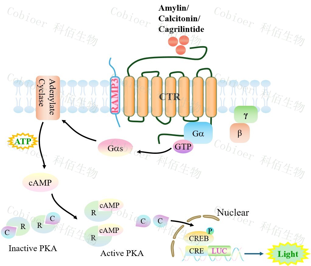 CTR&RAMP3 CRE-Luc CHO 報告基因藥靶模型很好的模擬了體內(nèi) CTR&RAMP3 的信 號轉(zhuǎn)導(dǎo)過程,原理見下圖所示。![]() Figure 1. CTR&RAMP3 CRE-Luc CHO 細(xì)胞模型原理圖 |