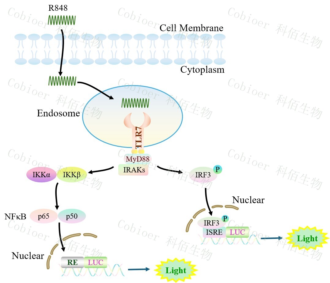 | TLR7 NFκB&ISRE Dual Reporter Cell 報(bào)告基因藥靶模型很好的模擬了體內(nèi) TLR7 的信號轉(zhuǎn)導(dǎo)過程,原理見下圖所示。  Figure 1. TLR7 NFκB&ISRE Dual Reporter Cell 細(xì)胞模型原理圖 | |