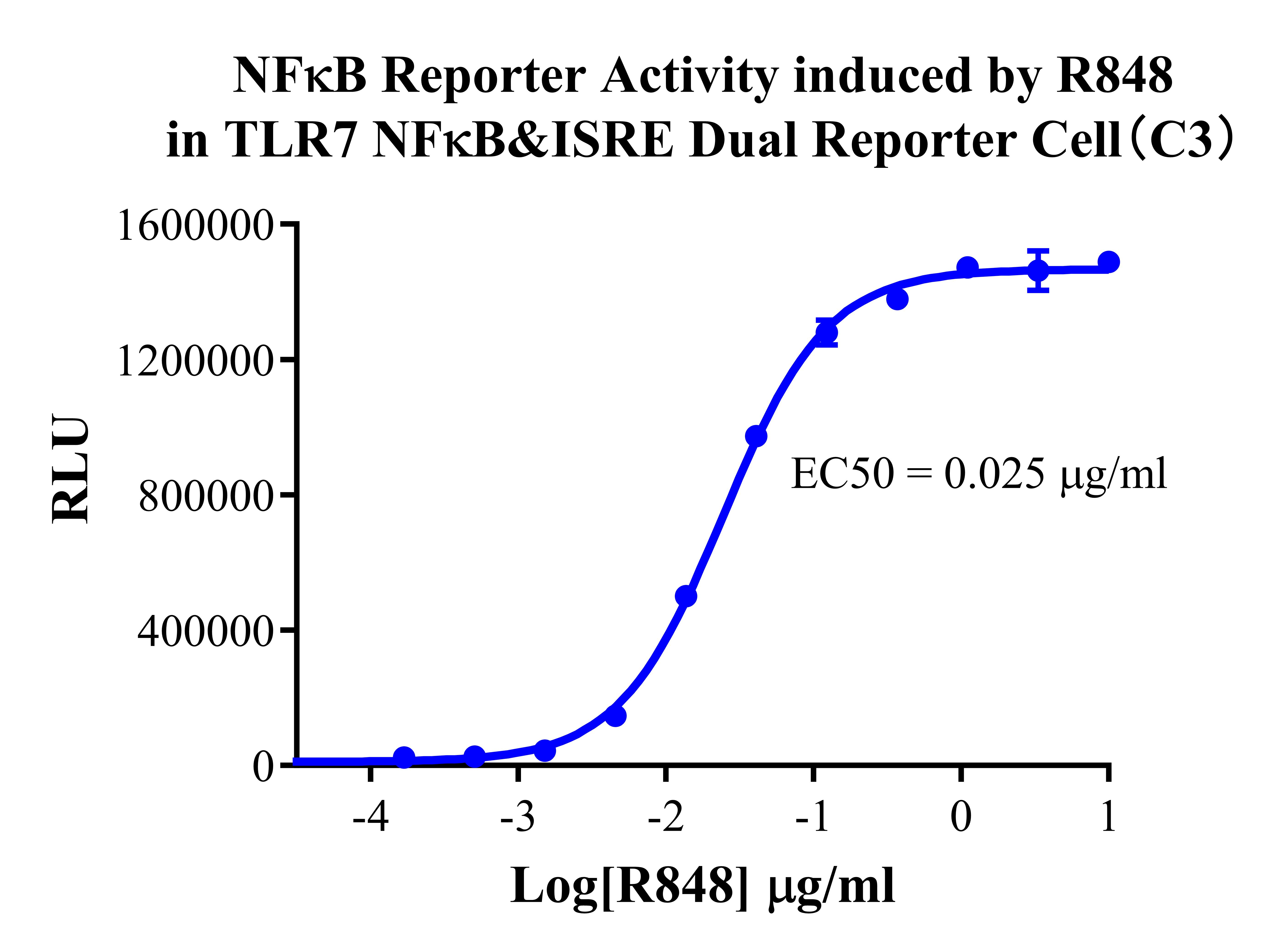 |  Figure 2.NFκB Reporter Activity induced by R848 in TLR7 NFκB&ISRE Dual Reporter Cell(C3).  Figure 3. ISRE Reporter Activity induced by R848 in TLR7 NFκB&ISRE Dual Reporter Cell(C3). | |