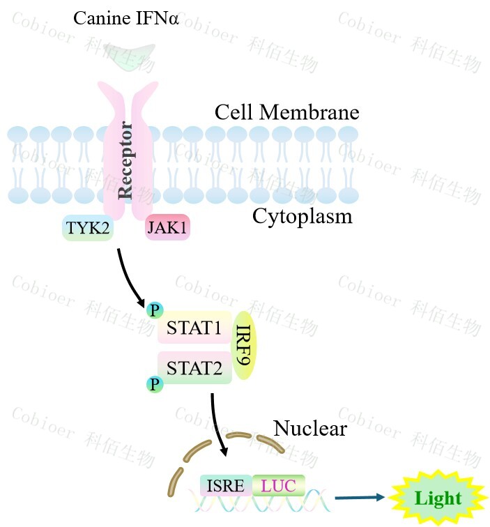 Canine IFNα&β Effector Reporter Cell 報告基因細(xì)胞,是由調(diào)控因子調(diào)控 并表達(dá) Luc 熒光素酶報告基因的重組細(xì)胞。IFNα與受體結(jié)合,激活 ISRE 的原理見下圖所示。![]() Figure 1. Canine IFNα&β Effector Reporter Cell 細(xì)胞模型原理圖 |