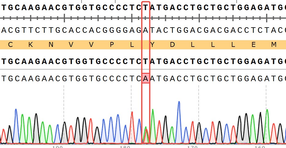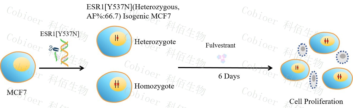 ESR1[Y537N](Heterozygous,AF%66.7) Isogenic MCF7 藥靶細胞,通過基 因編輯的方式將 ESR1 的 537 位氨基酸酪氨酸(Y)突變?yōu)樘於0罚∟)。![]() Figure 1. ESR1[Y537N](Heterozygous,AF%66.7) Isogenic MCF7 原理示意圖 |