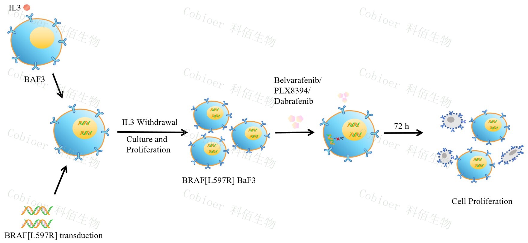 BaF3(小鼠原 B 細(xì)胞)的生長(zhǎng)和增殖需要 IL-3 的維持。通過(guò)引入各種表達(dá)激酶的基因, 能作為 BaF3 的驅(qū)動(dòng)基因,讓 BaF3 不再依賴 IL-3 而增殖,進(jìn)而激酶基因成為 BaF3 增殖依 賴的驅(qū)動(dòng)基因,用于評(píng)估小分子藥物對(duì)激酶的靶向抑制作用,原理及流程見(jiàn)下圖所示。 ![]() Figure 1. BRAF[L597R] BaF3 細(xì)胞的構(gòu)建原理圖 |